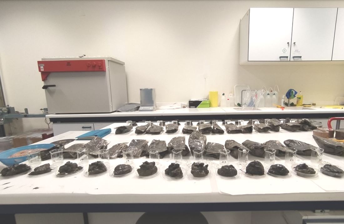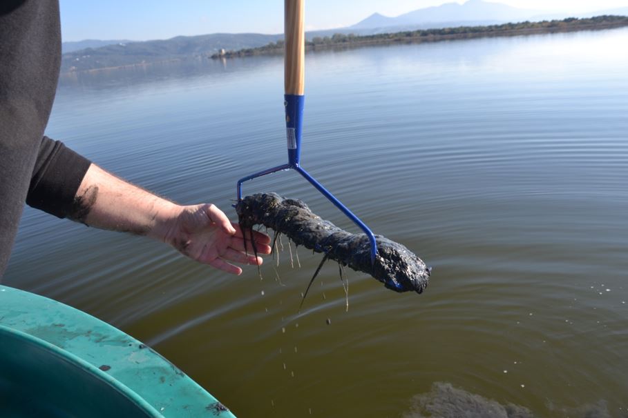 Sediment samples were collected from pre-defined sampling stations based on the backscatter properties of the lagoon floor, for the investigation of the spatial distribution of the lithological characteristics, and the major/trace elements and the organic carbon, and were subjected to macroscopic description, granulometry and chemical analysis.